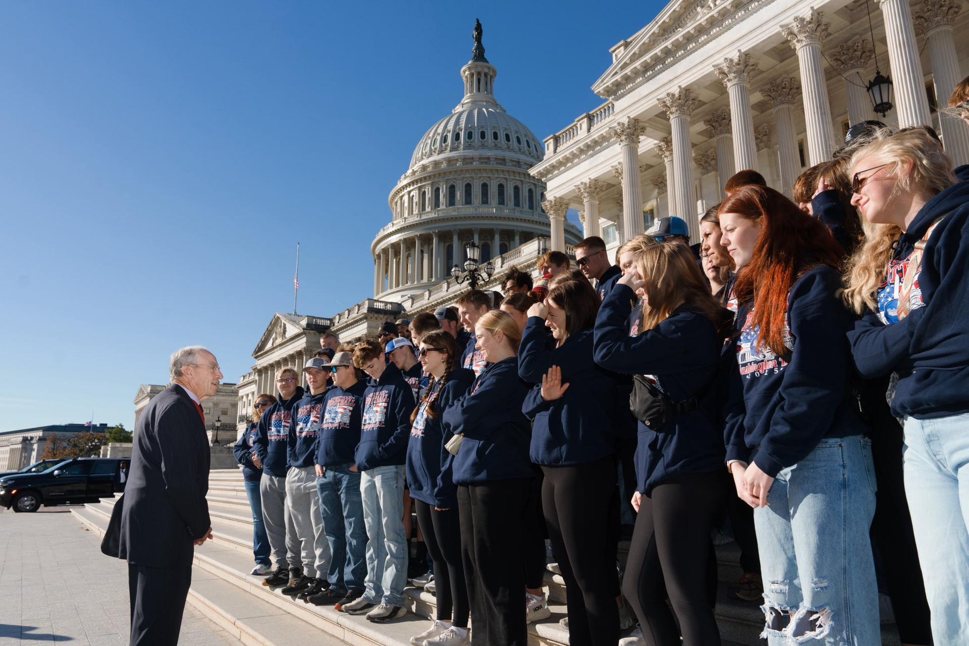 A Session with Senator Grassley: The group gathered on the steps of the U.S. Capitol for a special meet-and-greet with Senator Chuck Grassley, where students had the opportunity to ask questions and learn about leadership firsthand.